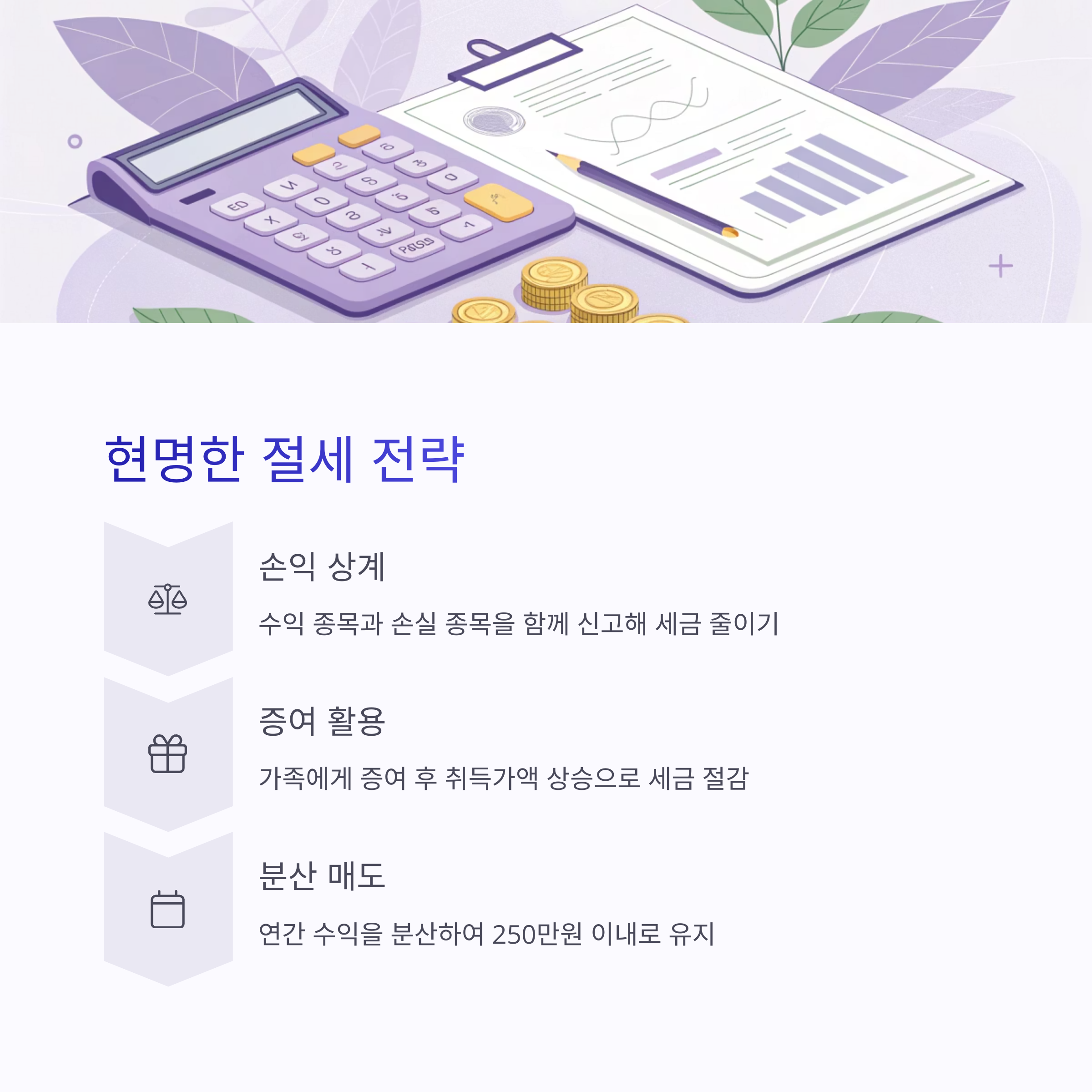 | 절세 전략 팁 | 손익 상계·증여·분산 매도 전략으로 세금 절감 |