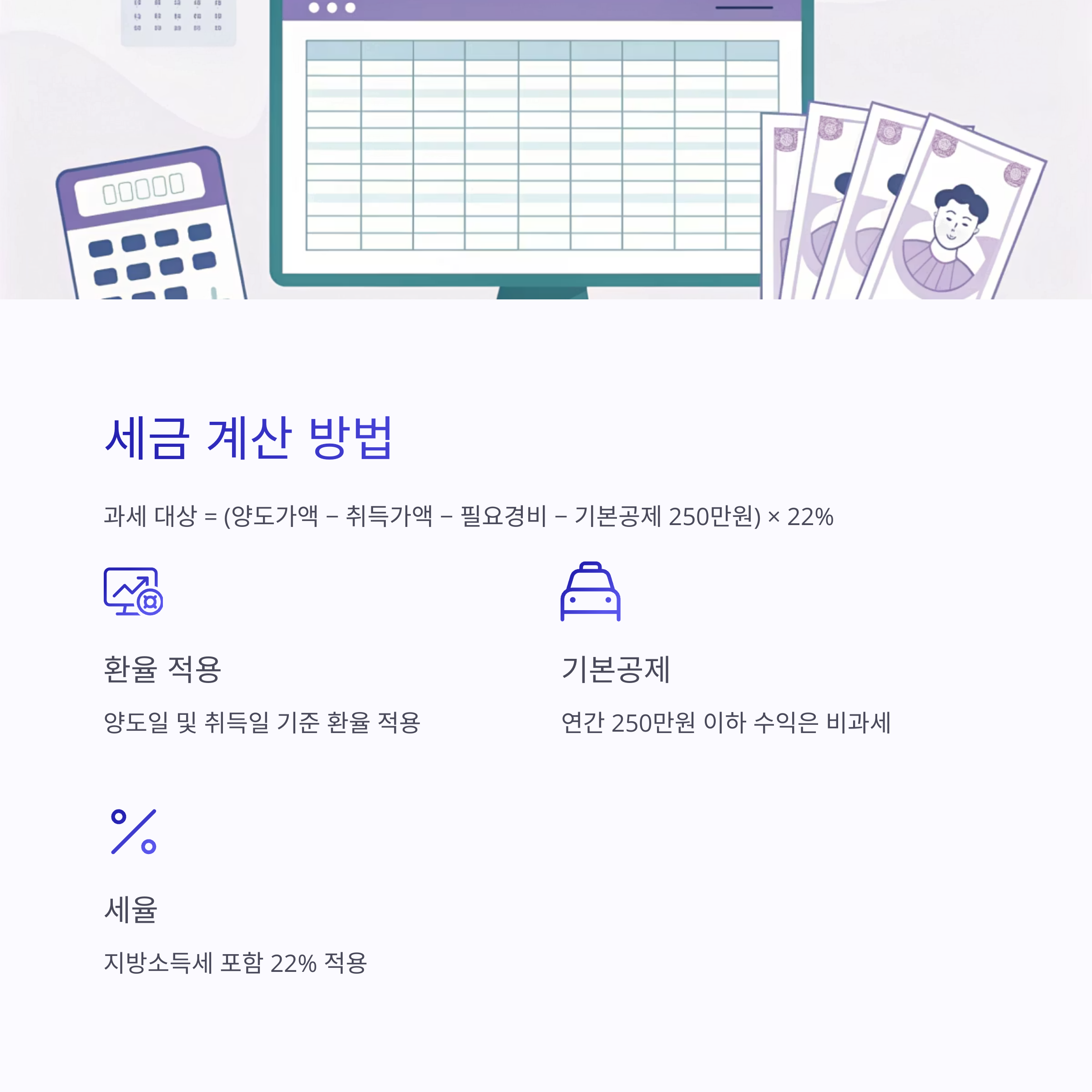 | 수익/취득가 입력 후 자동 계산 | 홈택스에 납부만 직접 진행 | 연도별 분산 매도로 250만원 이하 유지 |